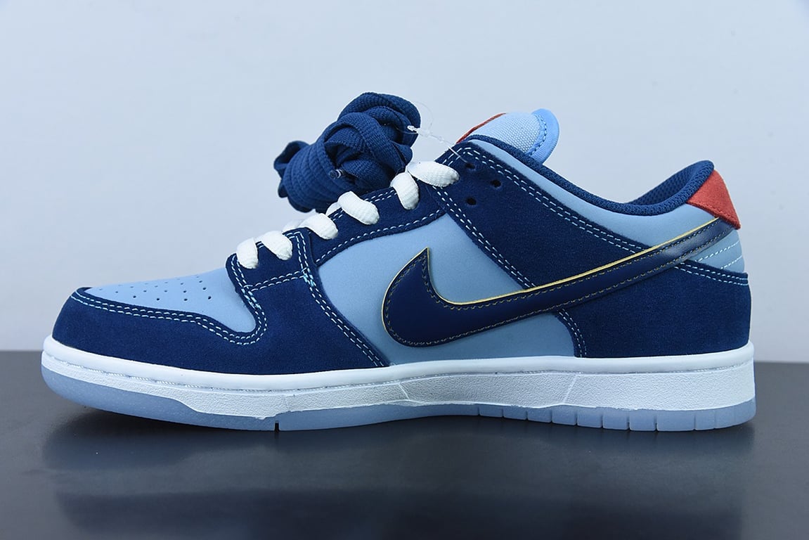 Designed in collaboration with the mental-health initiative founded by Scottish skater John Rattray, the Why So Sad? x Nike Dunk Low SB ‘The Predatory Bird’ features a design theme centered around positivity and wellness. The low-top sports a light blue leather upper with navy suede overlays and a wear-away Swoosh that fades from Coastal Blue to Speed Yellow. An embroidered graphic depicting the Predatory Bird mascot appears on the lateral heel, while a yellow question mark adorns the red suede heel tab. ‘Why So Sad?’ is inscribed on the interior tongue tag. Underfoot, a translucent rubber outsole yields grippy traction.