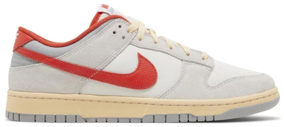 The Nike Air Dunk 85 Athletic Department brings a vintage aesthetic to the performance basketball shoe turned street-ready stalwart. The upper combines an off-white leather base with light grey suede overlays at the forefoot and heel. Picante Red accents settle on the leather Swoosh, Nike-branded back tab and interior lining. Inside the shoe, a custom Athletic Dept. graphic connects the model to its varsity sports roots. The low-top is mounted on traditional cupsole tooling, featuring pre-yellowed sidewalls and a grey rubber outsole.