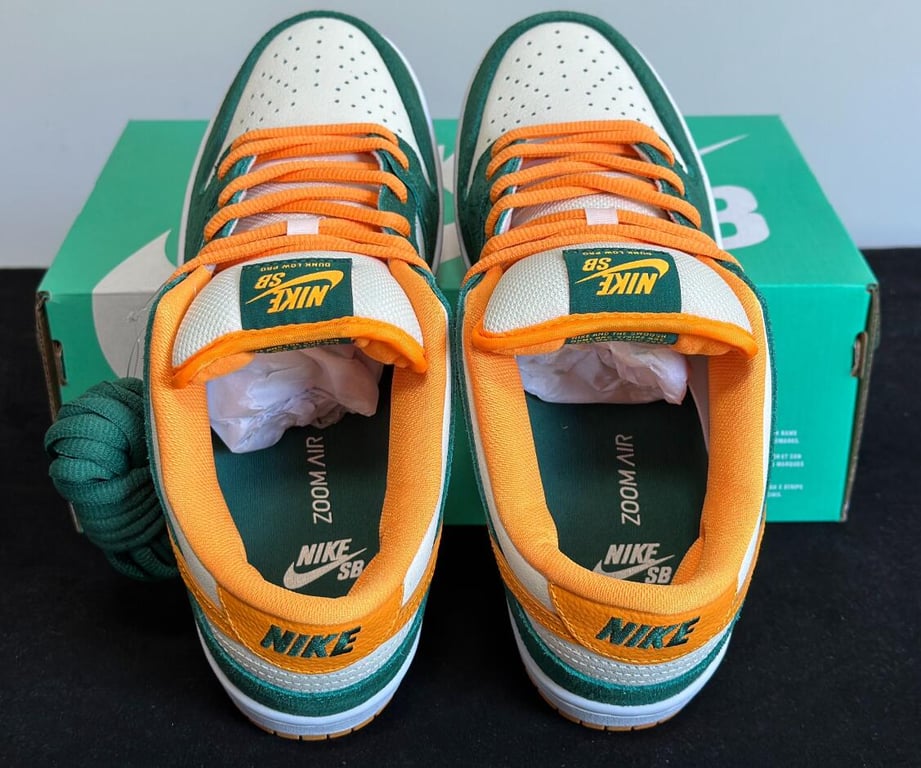 The Nike SB Dunk Low appears with a Legion Pine and Kumquat color scheme on the upper’s leather construction, while a crocodile-embossed etching emerges on the overlays for an elegant look. The Swoosh and heel tab take on a pebbled construction, while the sockliner features Zoom Air technology.