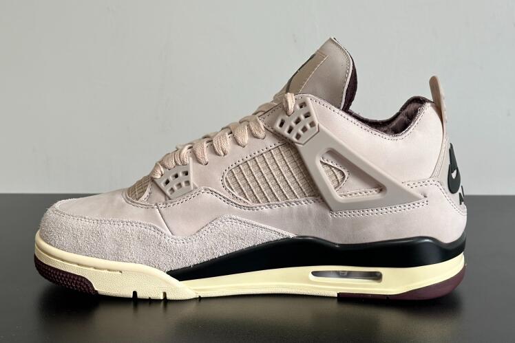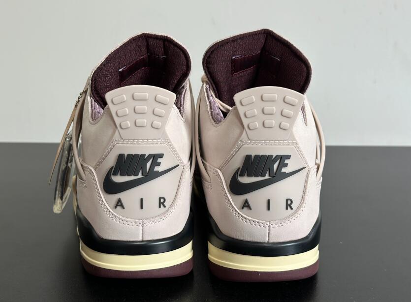 The A Ma Maniére x Women's Air Jordan 4 Retro 'While You Were Sleeping' showcases a light grey finish on the leather upper, featuring a tonal suede forefoot overlay and a deconstructed collar lined in quilted textile. Heritage details include quarter panel netting, molded eyelets and TPU support wings. Mismatched tongue tags display Jumpman and A Ma Maniére logos, while raised Nike Air branding adorns the back heel. A two-tone polyurethane midsole packs a visible Air-sole unit in the heel for lightweight cushioning.