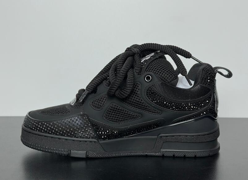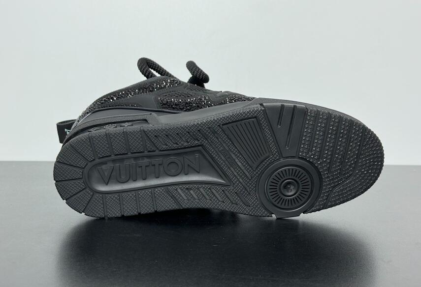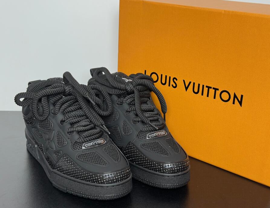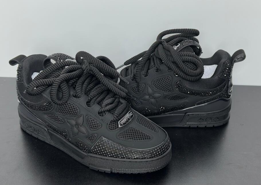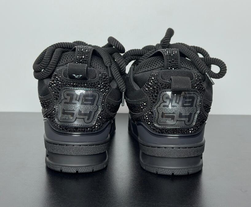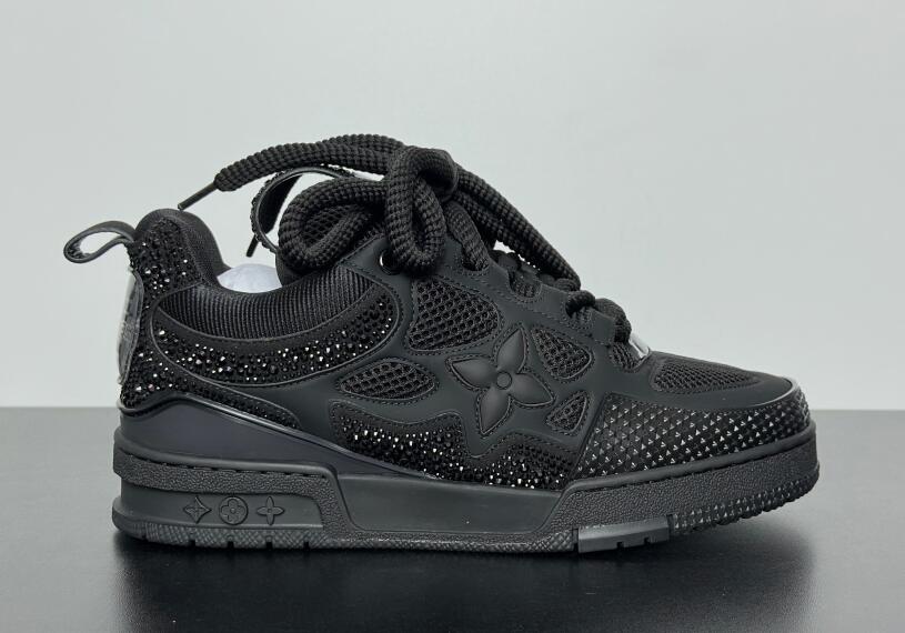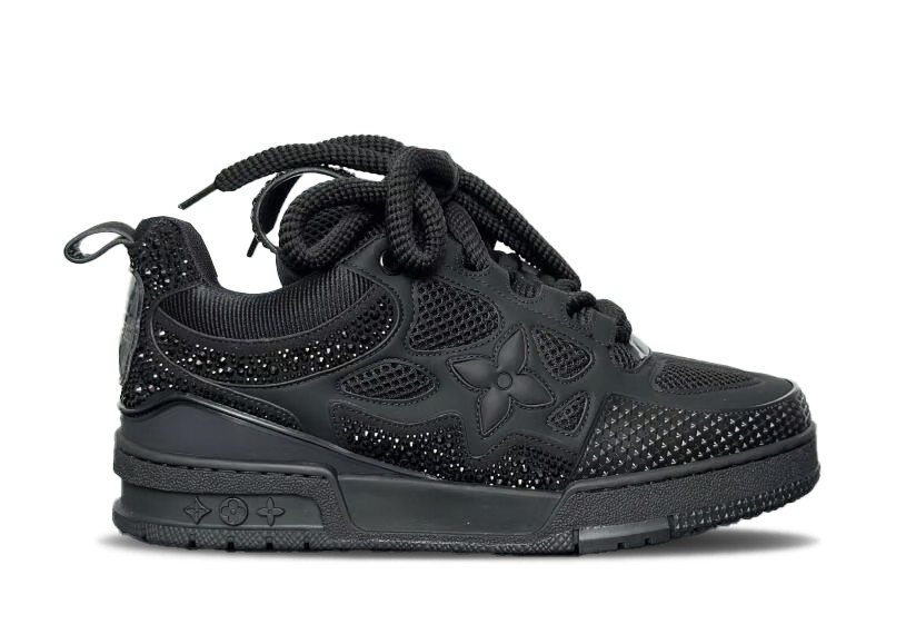 This exceptional interpretation of the LV Skate sneaker is covered in Swarovski™ crystals for a sparkling, all-black look. Inspired by Nineties' skate shoes, this model is characterized by its exaggeranted, padded collar and tongue. It features an array of signature details, including a Monogram Flower on the side and the mention Vuitton since 1854 at the back.