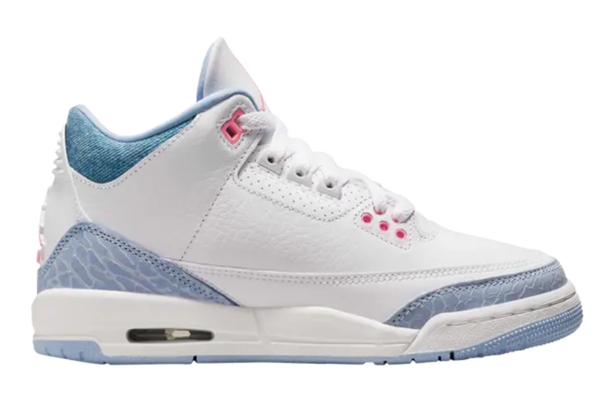 Made for big kids, the Air Jordan 3 Retro GS 'White Cobalt Bliss' showcases a white leather upper with elephant print overlays at the forefoot and heel in a powder blue finish. Light blue denim is utilized on the padded collar, while molded eyelets are rendered in Pink Glow, matching the Jumpman branding hits that adorn the tongue and heel tab. Anchoring the sneaker is a white polyurethane midsole with visible Air-sole cushioning in the heel.