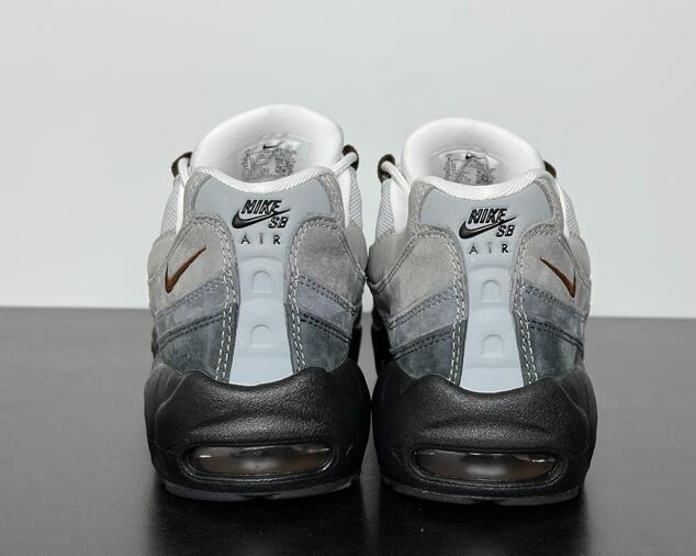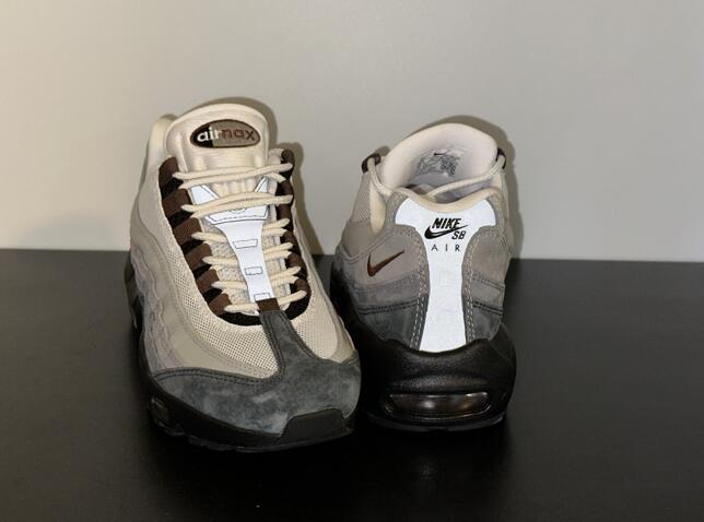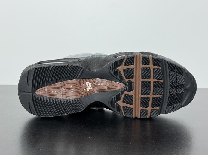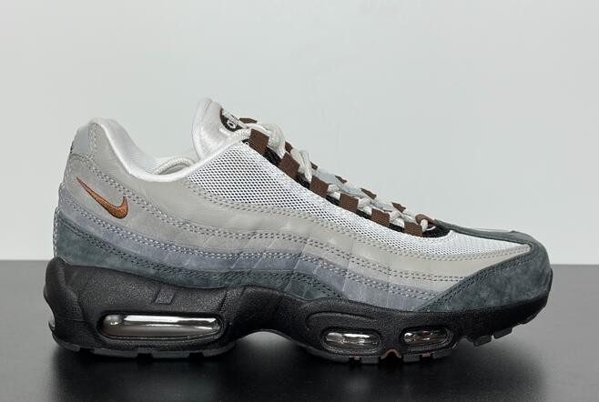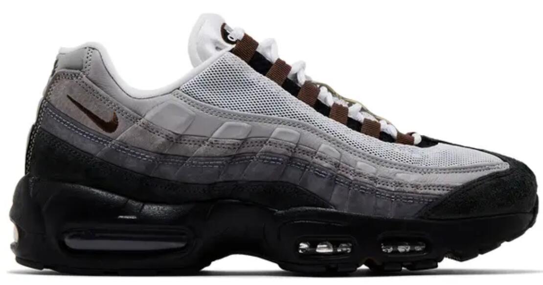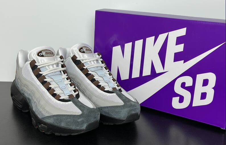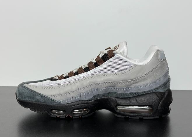 The Nike SB Air Max 95 OG 'Cacao Wow' delivers a skate-ready edition of the classic retro running shoe. Laces feed through brown webbing eyelets to secure the mixed-material upper, featuring folded edges and double-stitch reinforcement in key wear areas. The side panels are covered in four wavy layers, one in leather, the bottom three in suede, with a gradient design that transitions from light grey to dark. An embroidered Air Max patch adorns the tongue, while Nike SB Air branding is embossed on the molded heel panel. Revised tooling takes the form of a reduced-foam polyurethane midsole with exposed Max Air cushioning. The rubber outsole is updated with herringbone-traction lugs for superior board feel.