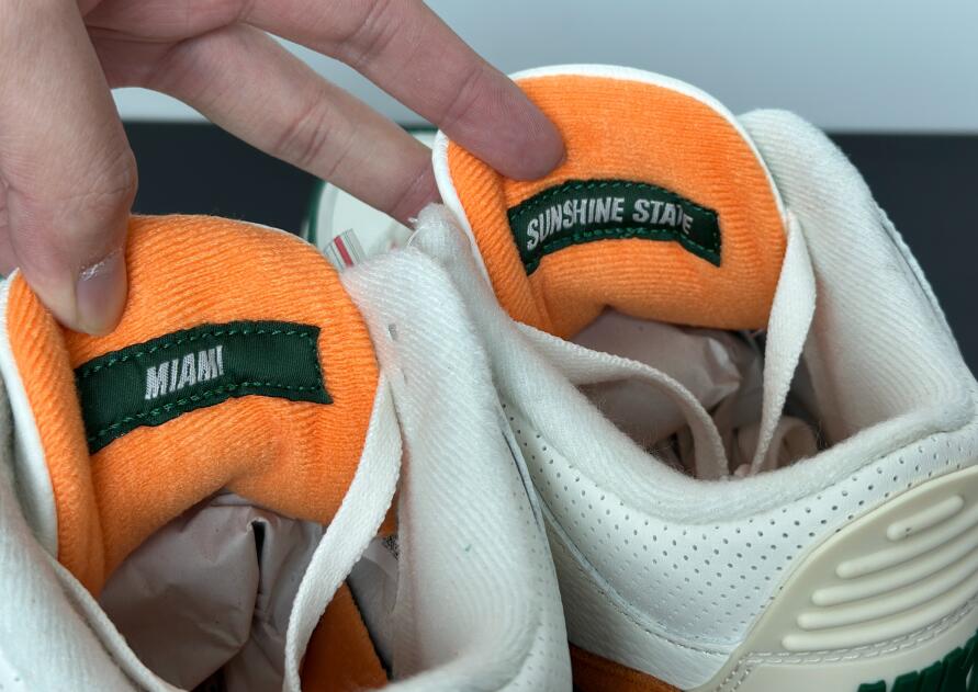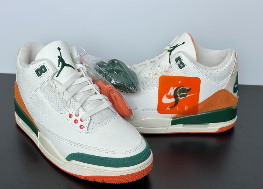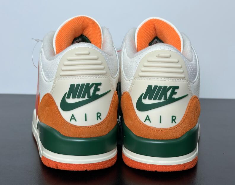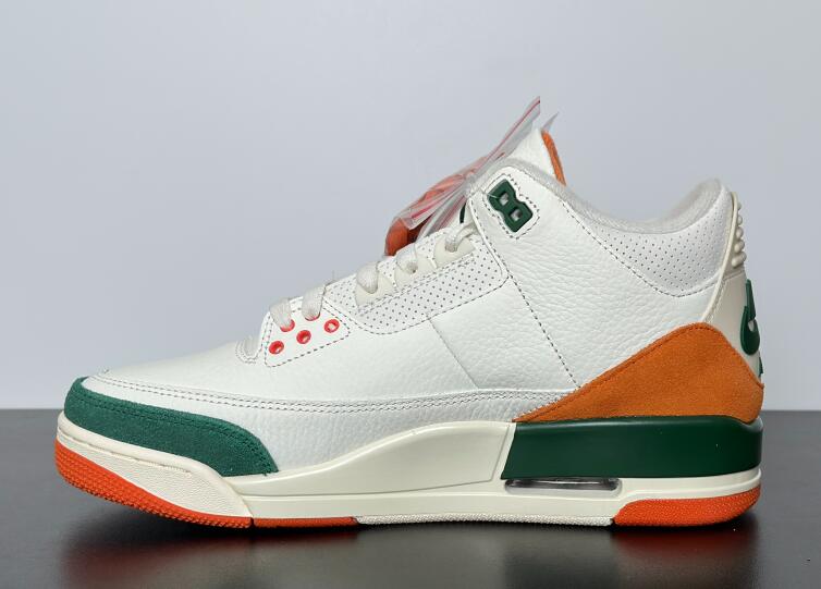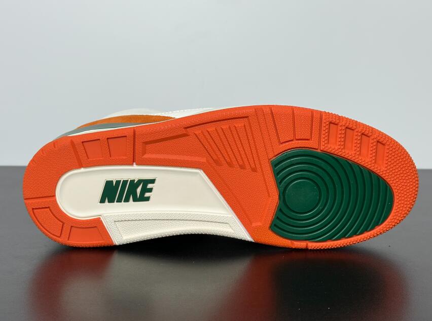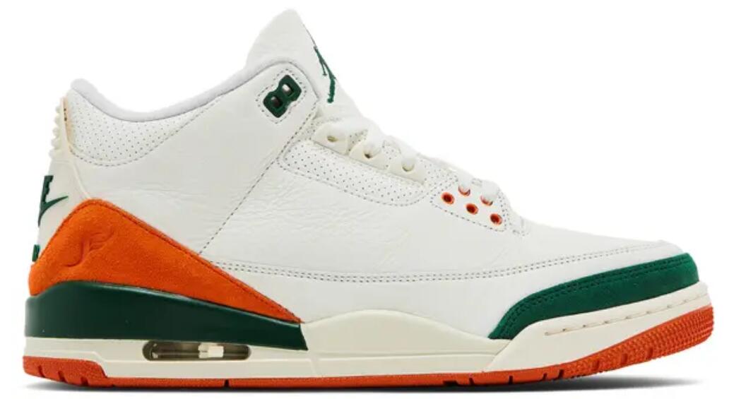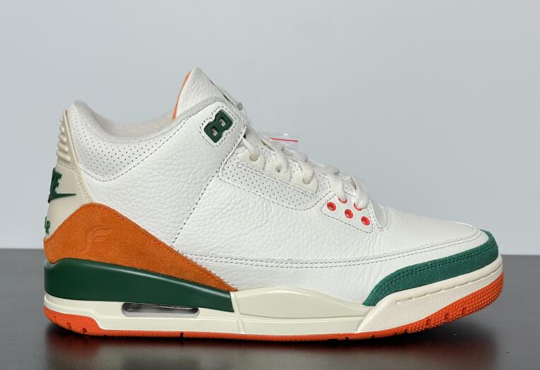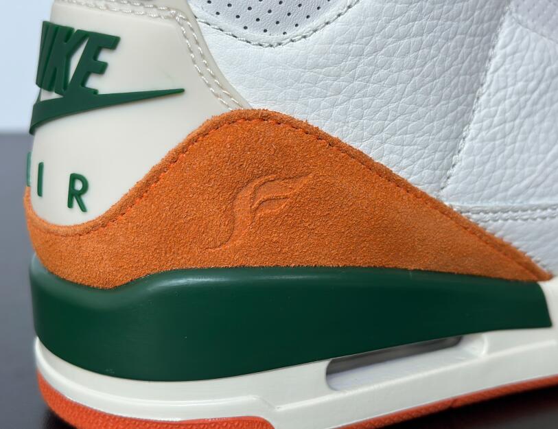 The SoleFly x Air Jordan 3 'Miami' showcases the signature colors of the Miami Hurricanes, featuring a Sail-colored leather upper with orange and green suede overlays at the forefoot and heel. A Jumpman logo adorns the tongue in green embroidery, matching the upper eyelets and the raised Nike Air branding that graces the heel tab. A vintage off-white finish is applied to the polyurethane midsole, fitted with visible Air-sole cushioning and accented with a splash of green along the heel. An orange rubber outsole provides durable traction underfoot.