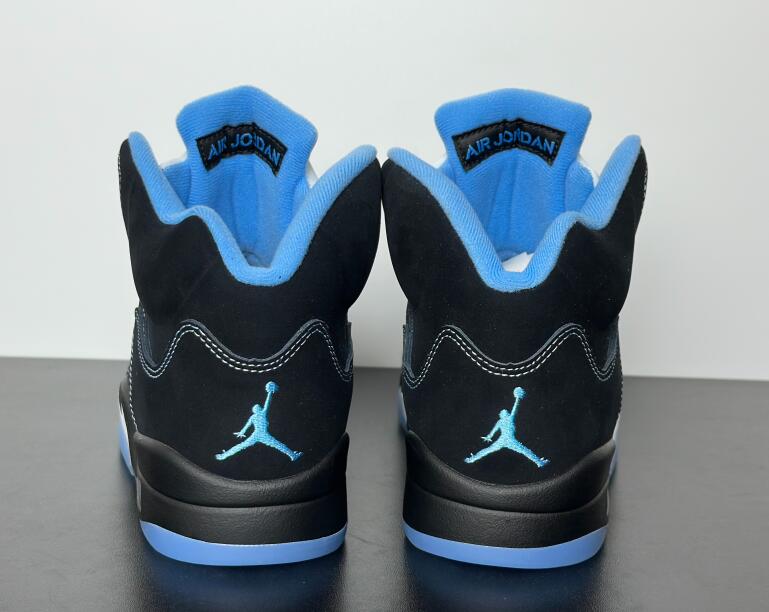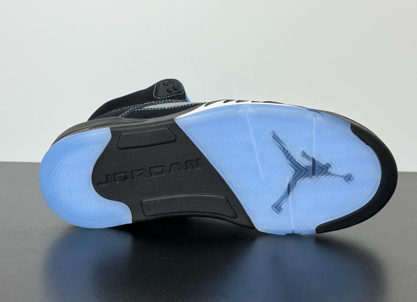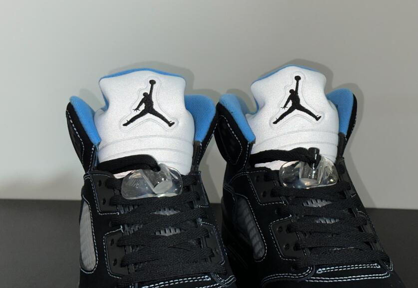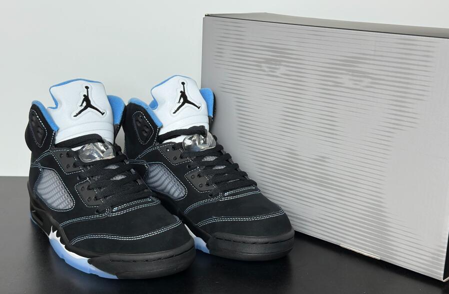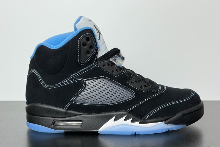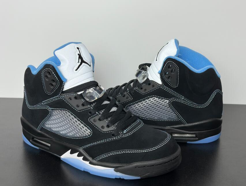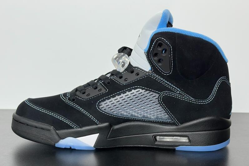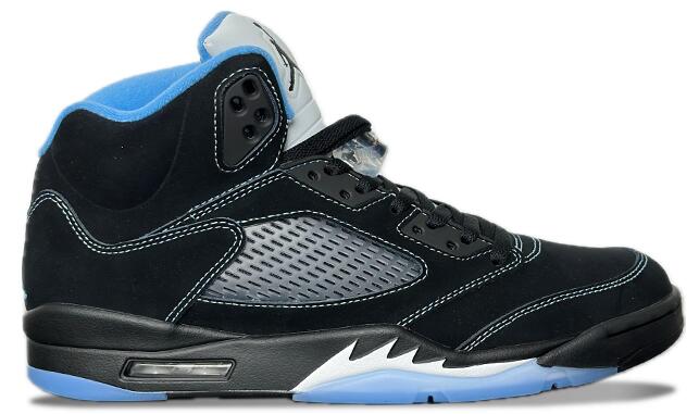The 2026 reissue of the Air Jordan 5 Retro 'Black University Blue' brings back a 2006 colorway that originally released as part of Jordan Brand's Lifestyle (LS) series. Black nubuck is utilized on the upper, accented with contrast stitching and equipped with translucent quarter panel netting. University Blue textile lines the collar, matching the embroidered Jumpman that adorns the heel. A second Jumpman icon decorates the silver reflective tongue. The sneaker is mounted on a black polyurethane midsole with white shark tooth detailing and a visible Air-Sole unit in the heel. A translucent herringbone-pattern rubber outsole provides grippy traction underfoot.