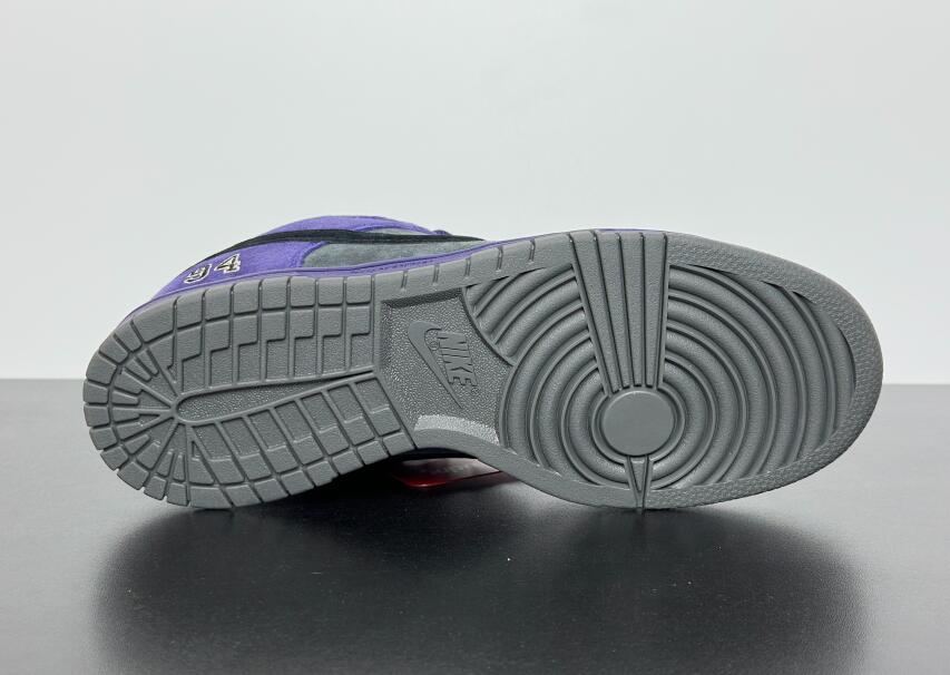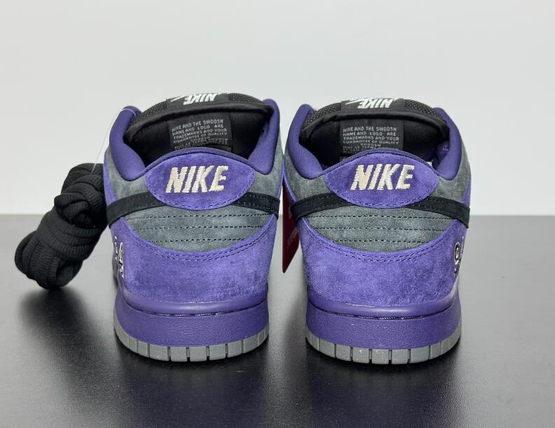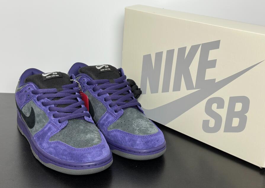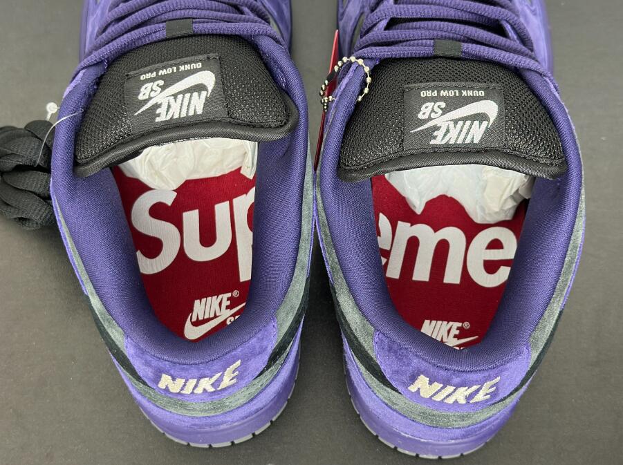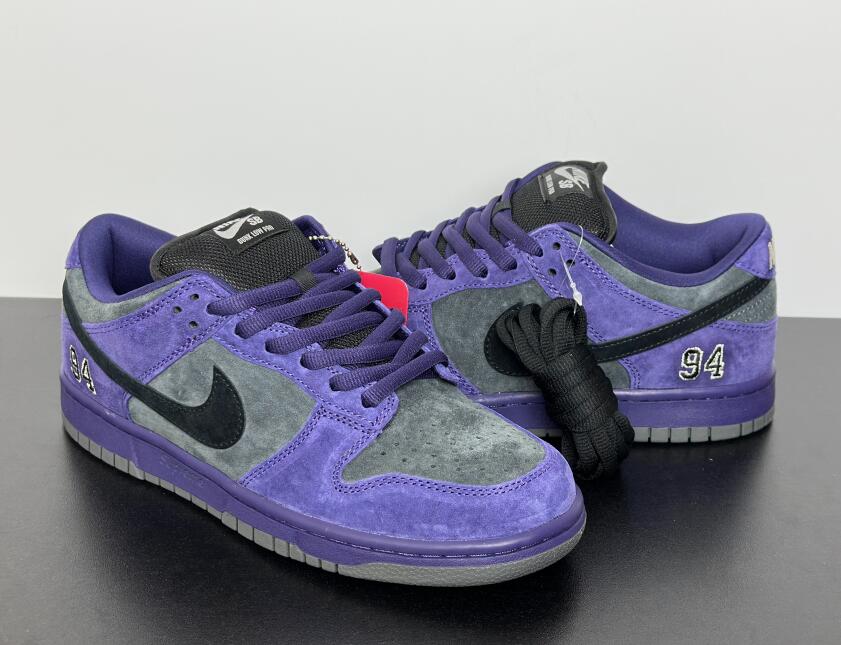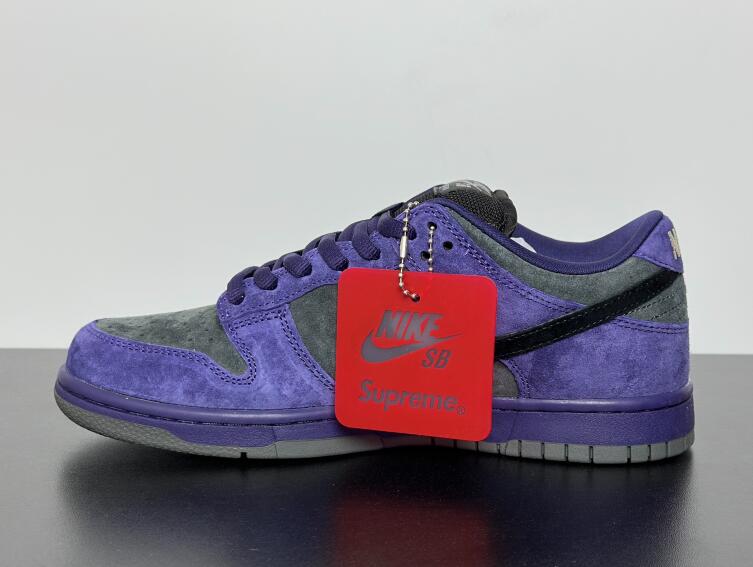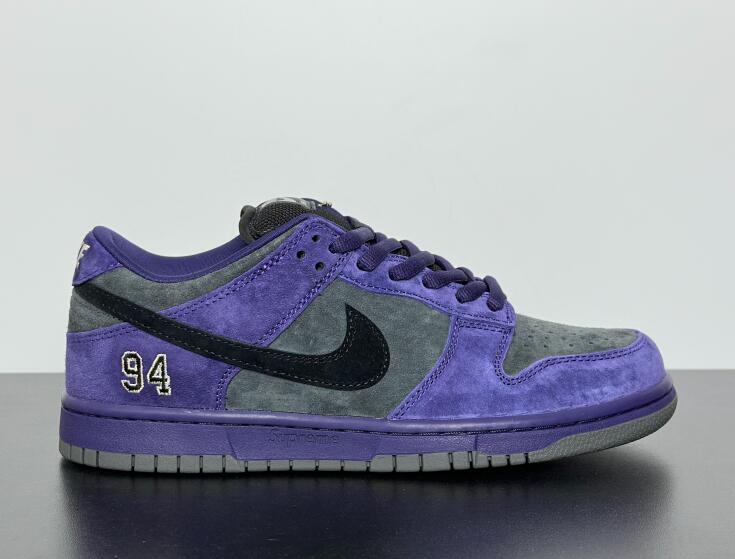 Drawn from a collaborative footwear pack, the Supreme x Nike Dunk Low SB 'Ink' employs a suede upper, featuring a charcoal base with a black signature Swoosh and inky blue overlays at the forefoot and heel. Referencing Supreme's founding year, '94' is embroidered on the lateral heel, while a standard Nike wordmark adorns the back tab. A woven Nike SB tag embellishes the stuffed mesh tongue. The sneaker rests on a blue rubber midsole with 'Supreme' debossed on the lateral sidewall.