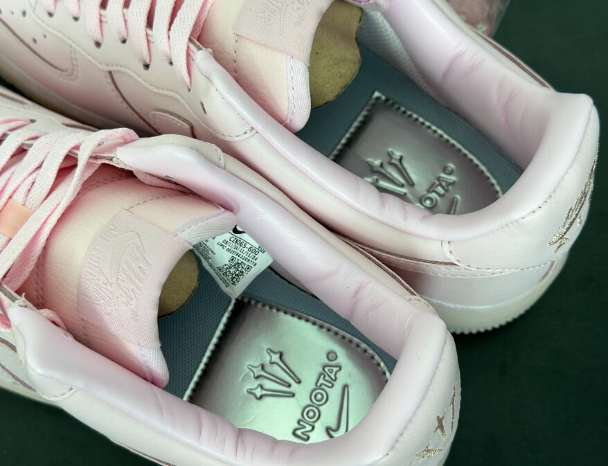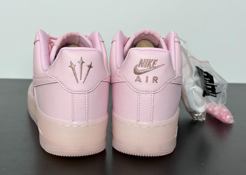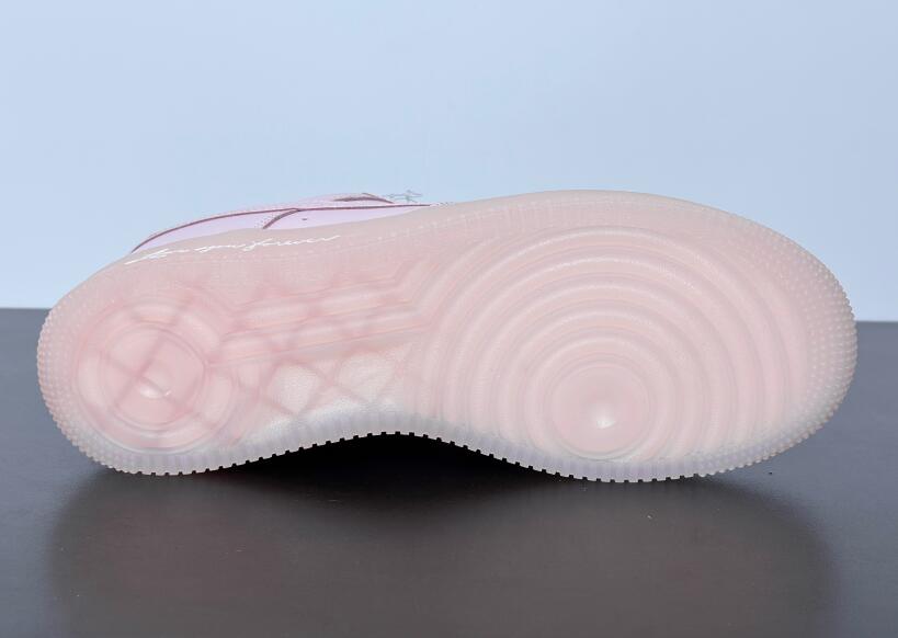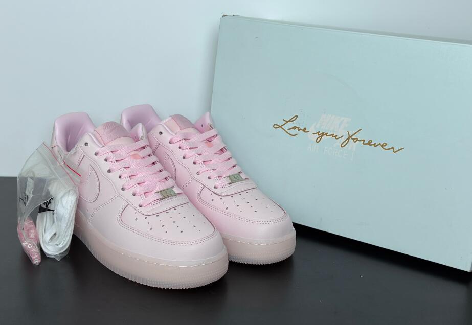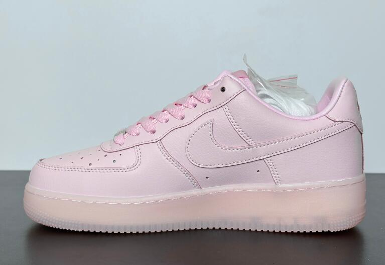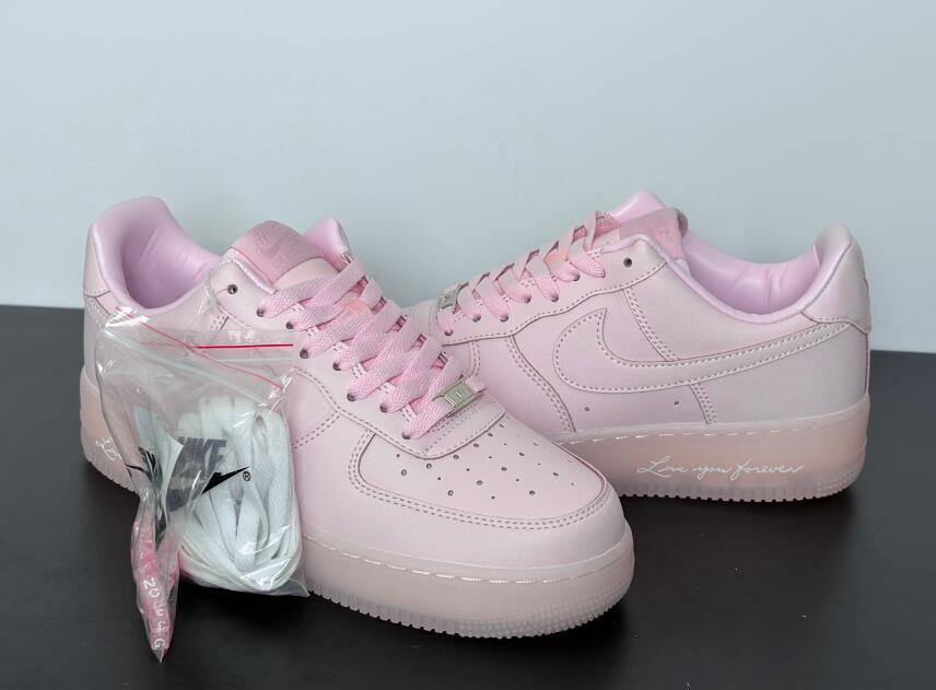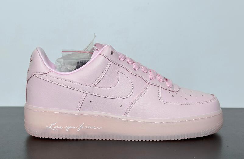 The NOCTA x Nike Air Force 1 Low 'Certified Lover Boy - Pink Foam' floods the tumbled leather upper with a soft pink hue, featuring contrasting Cobalt Tint accents on the Swoosh and back tab. The latter features Nike Air branding on the right shoe and the NOCTA North Star logo on the left. 'Love You Forever' is inscribed on the lateral midsole. The romantic theme continues with a rubber outsole that replaces the traditional stars with embossed hearts.