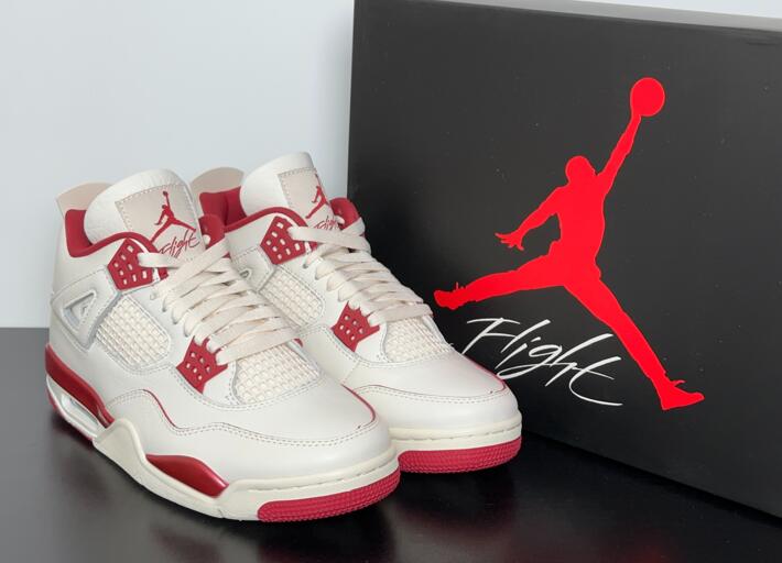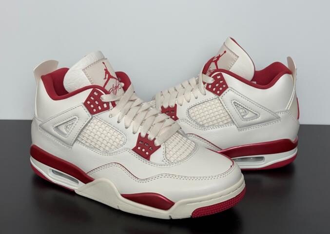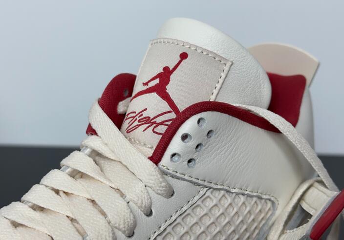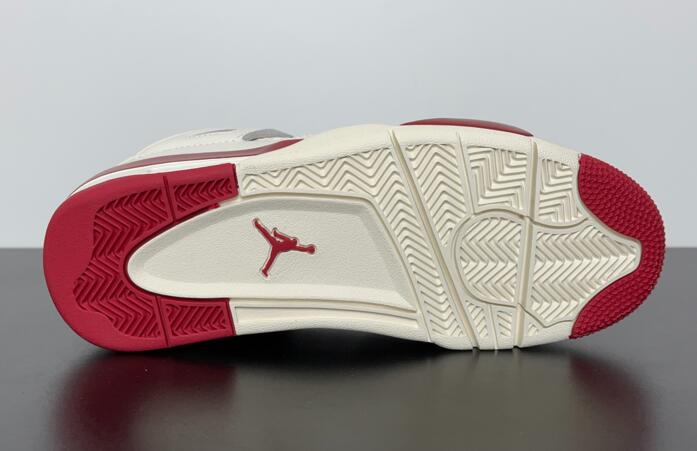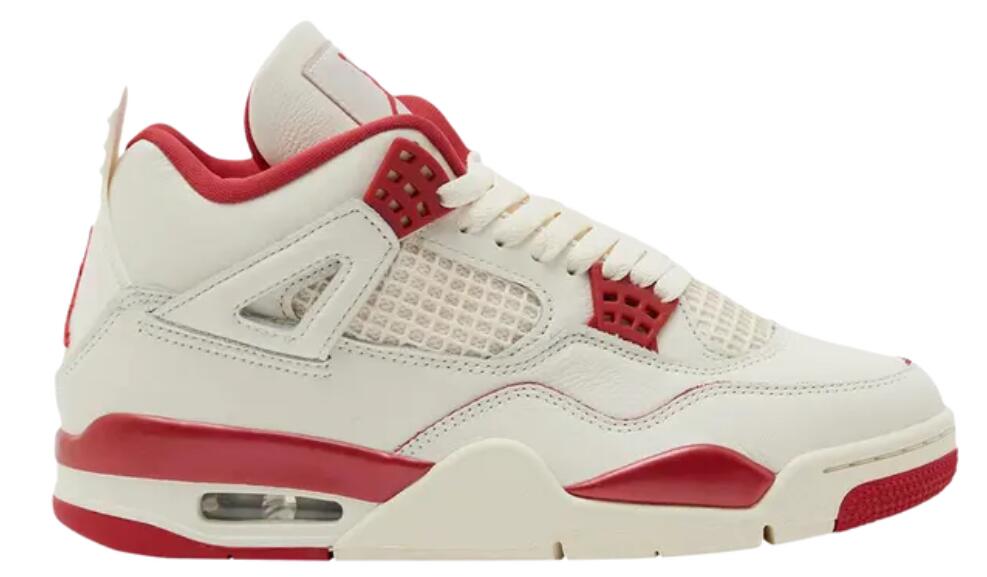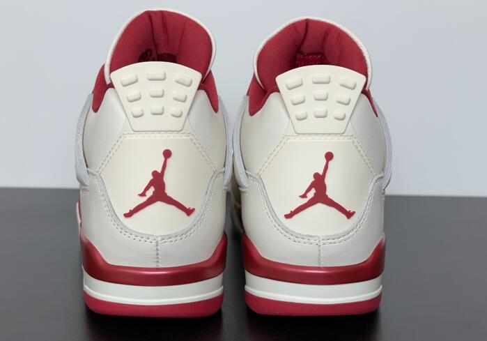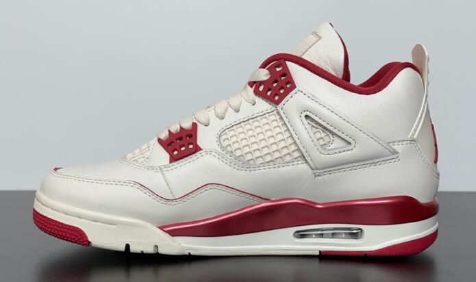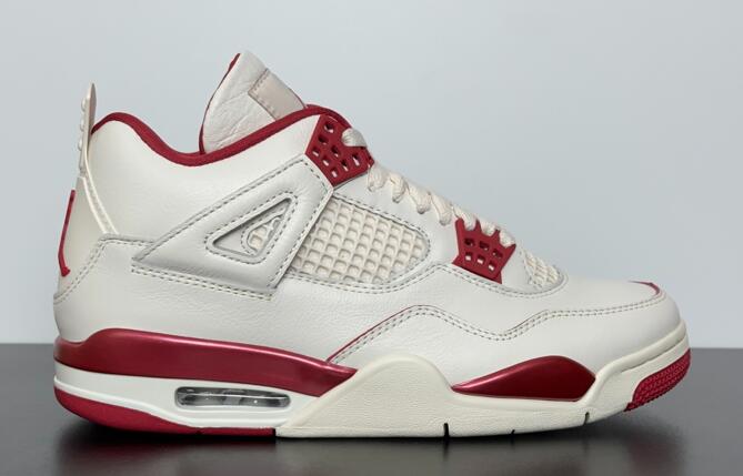 The Air Jordan 4 Retro 'Valentine's Day' celebrates the romantic holiday with a simplistic two-tone design. The legacy silhouette dons an off-white leather upper with contrasting Sierra Red accents. They settle on the molded eyelets and textile collar lining, as well as the Jumpman logo that decorates the woven tongue tag and heel tab. Additional scarlet accents make their way to the polyurethane midsole, fitted with an exposed Air-sole unit in the heel.