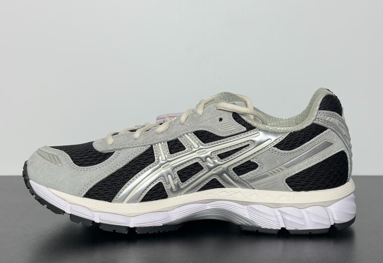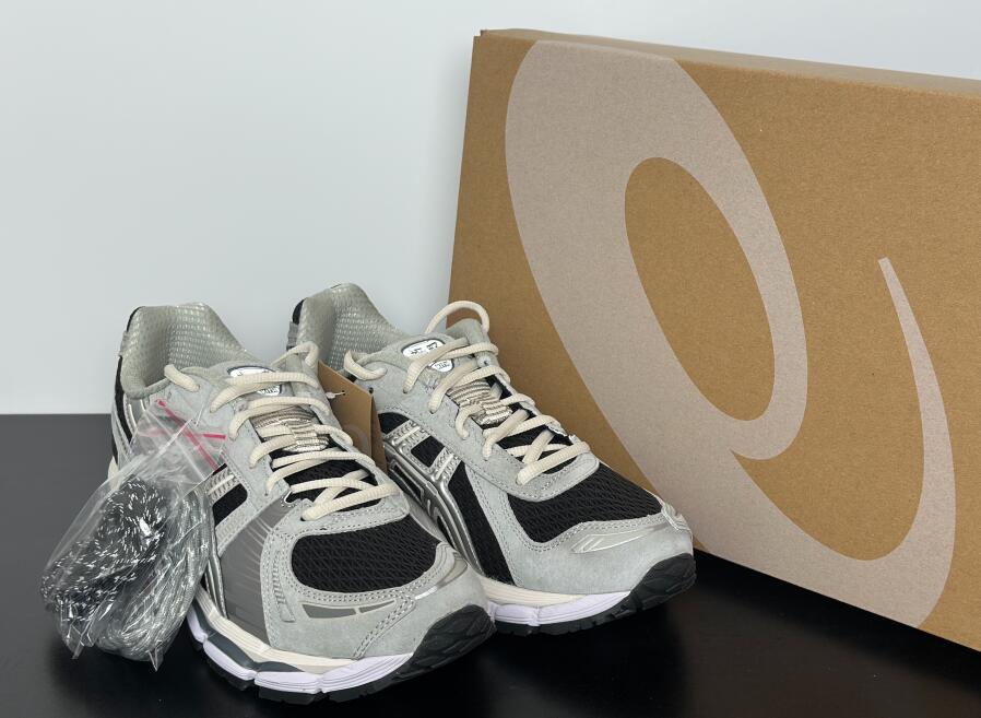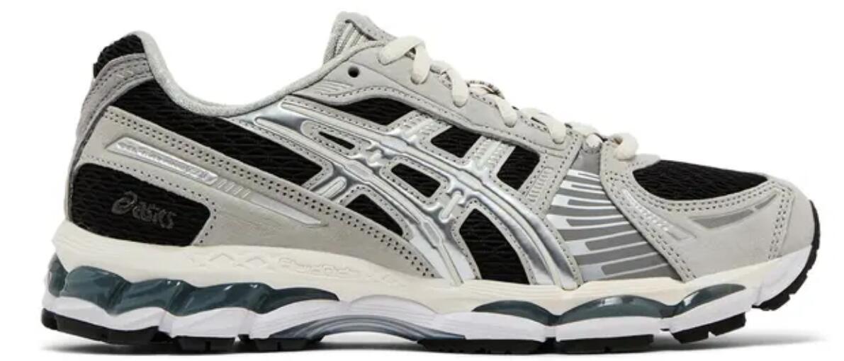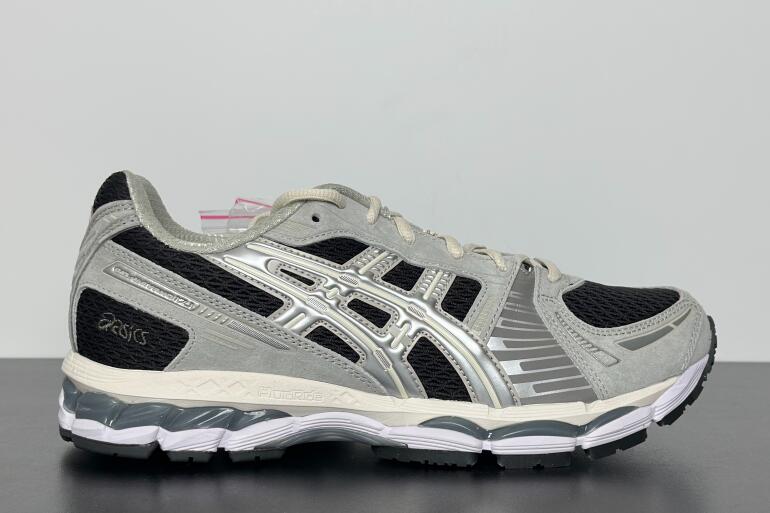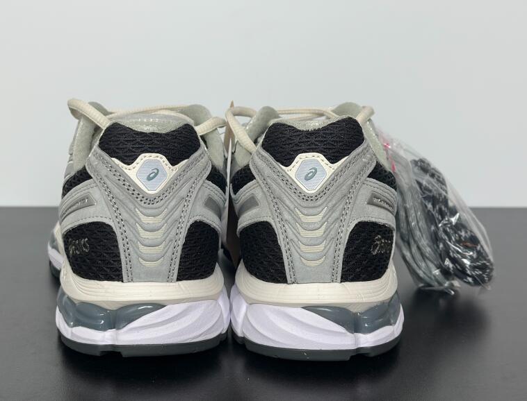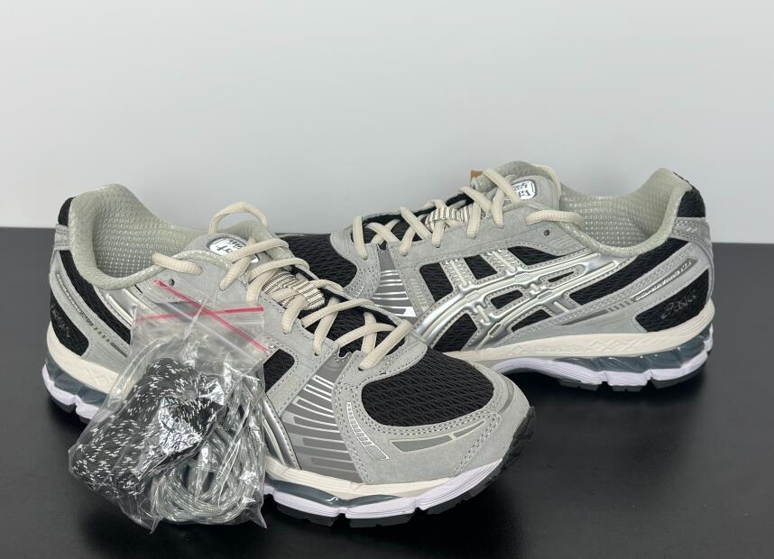 The Kith x ASICS Gel Kayano 12.1 'Peat Cream' employs an anthracite woven mesh upper with light grey suede overlays and raised tiger stripes in metallic silver. Atop the tongue, a triangular badge displays the Japanese word 'tomodachi' and the Kith logo. Dual branding decorates the sockliner. A full-length EVA midsole packs visible Gel cushioning in the forefoot and heel.