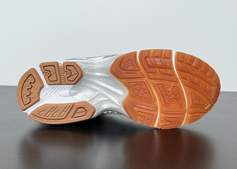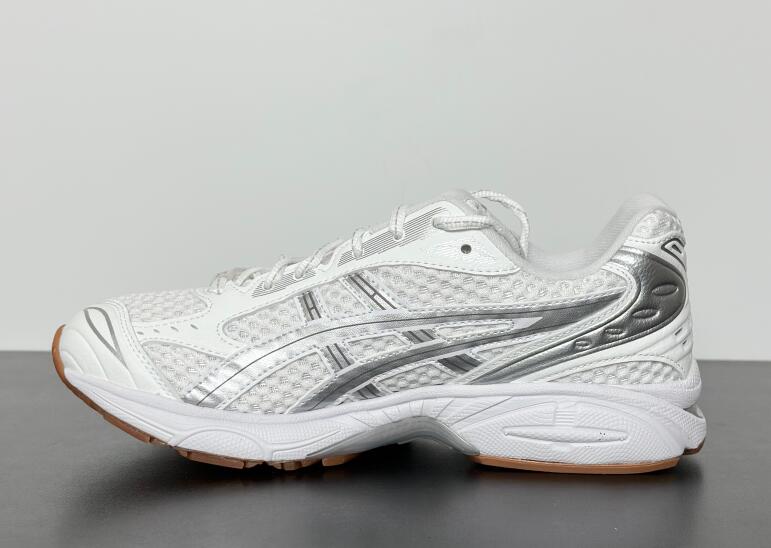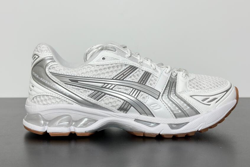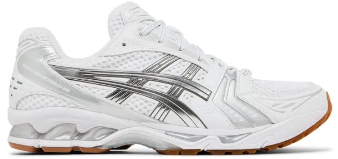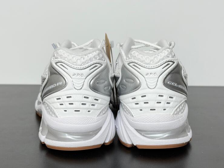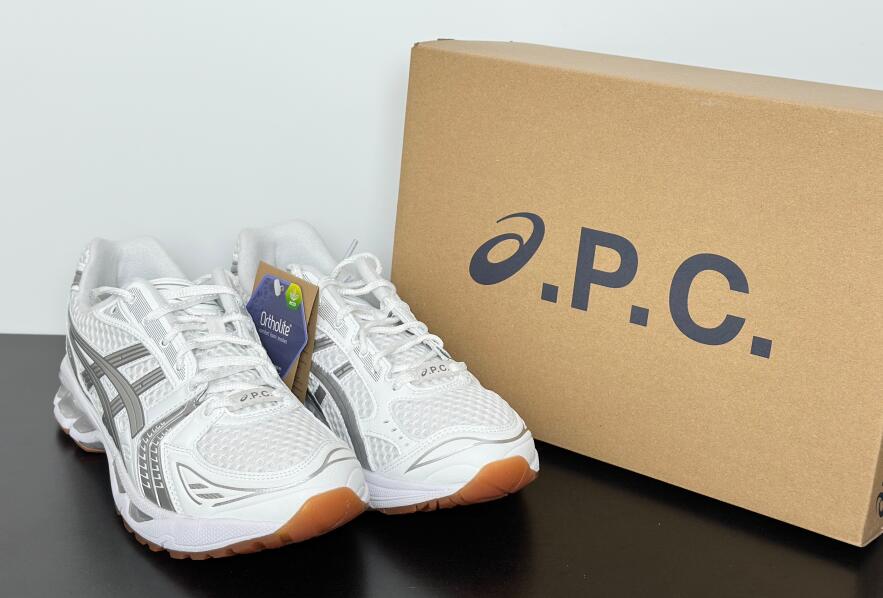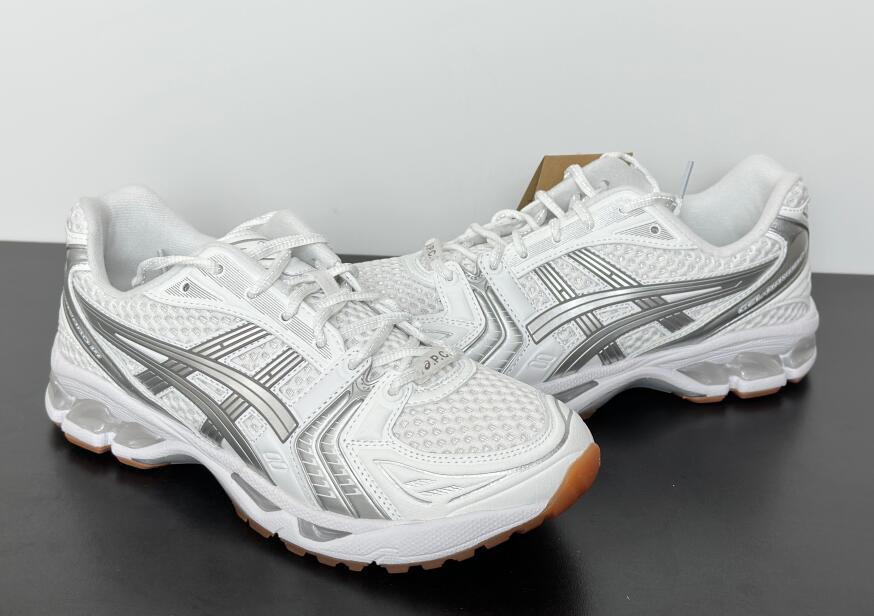 The A.P.C. x ASICS Gel Kayano 14 'White Pure Silver' reunites the partner brands as part of a tennis-inspired capsule collection. The lifestyle runner sports an airy white mesh upper with tonal synthetic leather overlays and metallic silver side stripes. Dual branding is stamped on the sockliner, while ASICS' spiral logo is integrated into the A.P.C. wordmark that decorates the heel tab. Anchoring the sneaker is a lightweight EVA midsole with visible Gel cushioning.