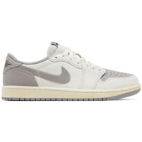 This offering of the low-top Air Jordan 1 features a White leather base with Emerald Green suede overlays and Grey Swooshes. A White midsole atop a Grey rubber outsole completes the design.