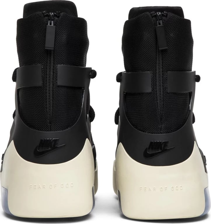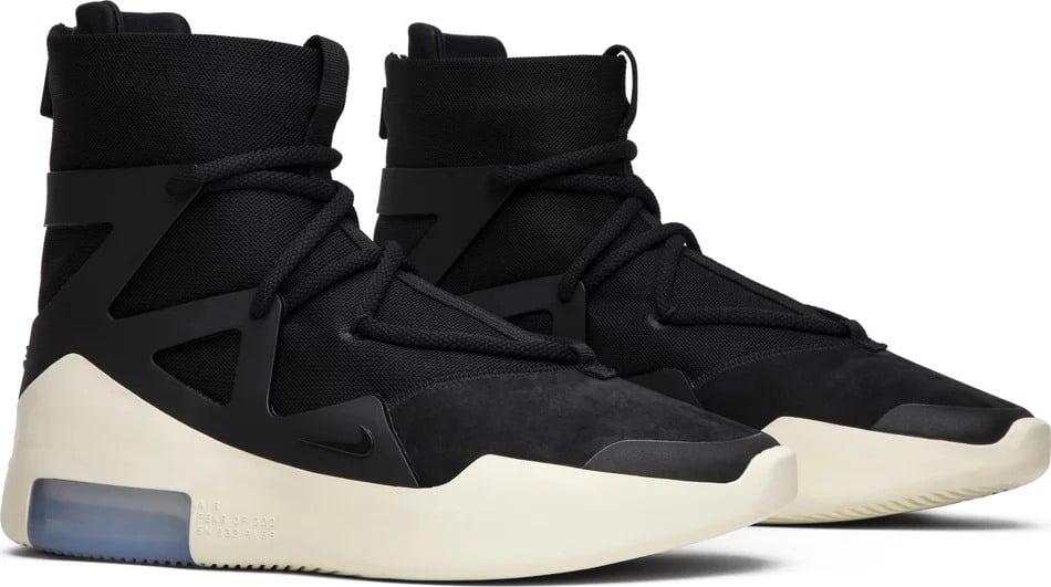 The Air Fear of God 1 ‘Black’ is one of the inaugural colorways of the performance basketball shoe made in collaboration between Nike and Jerry Lorenzo’s Fear of God. The fashion-forward silhouette uses a brand new last made expressly for the specific model, topped with a minimalist black leather upper with a TPU cage inspired by the Huarache Light. The tooling takes the form of a contrasting white cup sole with a visible double-stack Zoom heel unit.