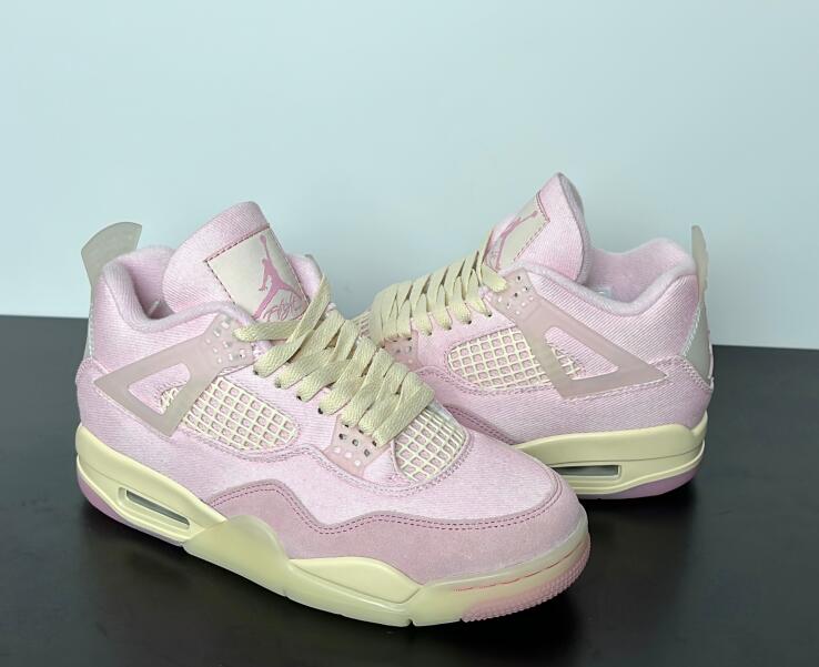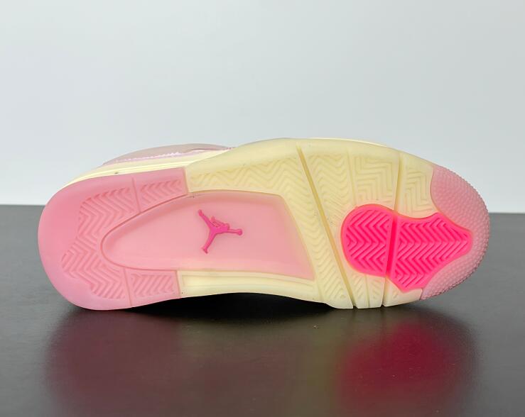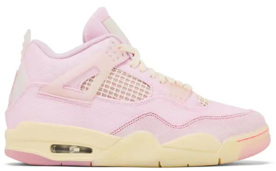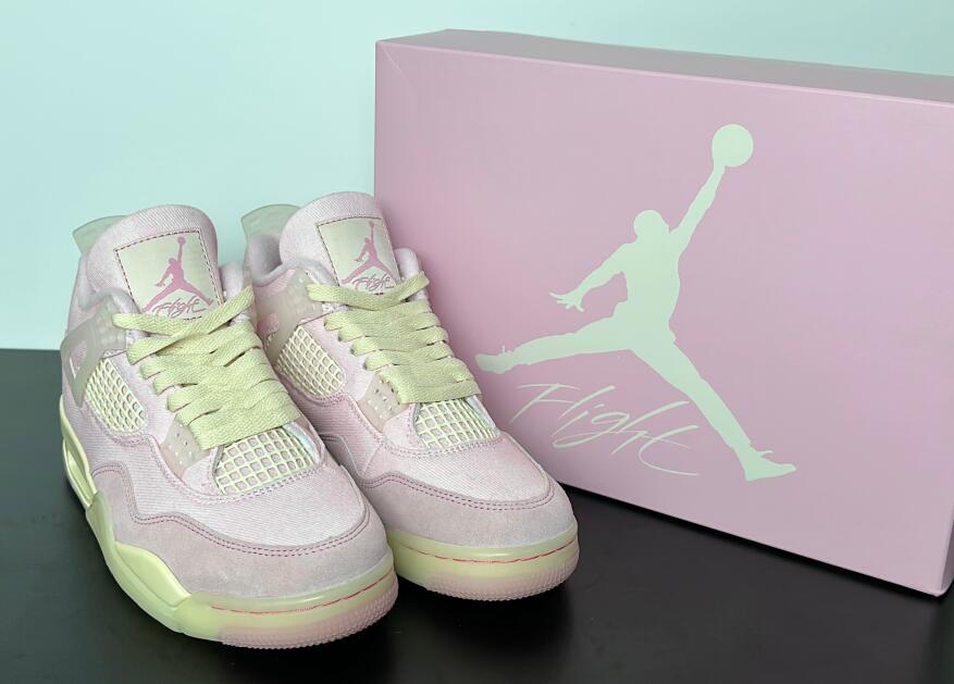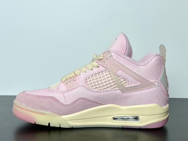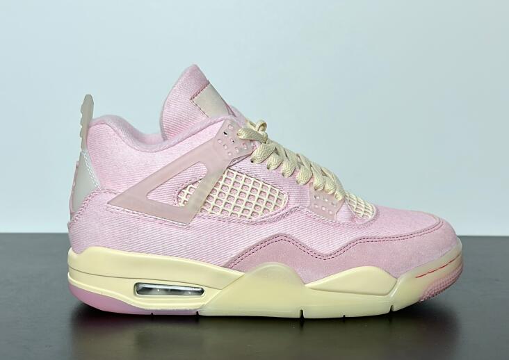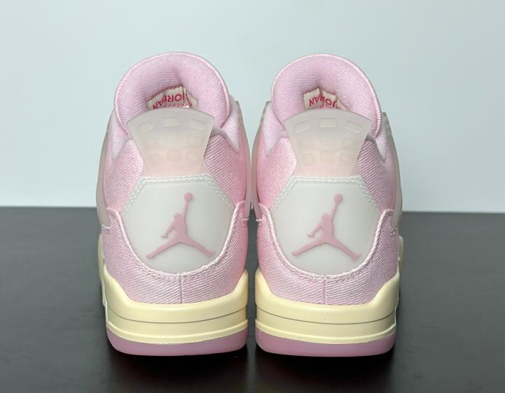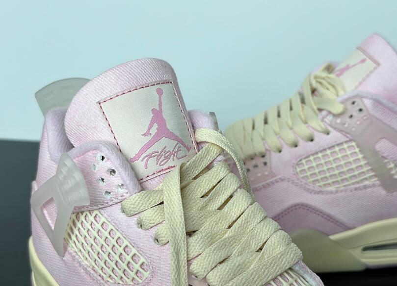 The Air Jordan 4 Retro 'Iced Carmine' updates the legacy model with a pastel color scheme, highlighted by a pink textile upper with a tonal suede forefoot overlay and breathable quarter panel netting. Semi-translucent TPU is utilized on the molded eyelets and signature support wings, along with a heel tab marked with Jumpman branding. A second Jumpman icon decorates the woven tongue tag. The sneaker sits atop a cream-colored polyurethane midsole, fitted with visible Air-Sole cushioning in the heel and supported by a translucent rubber outsole underfoot